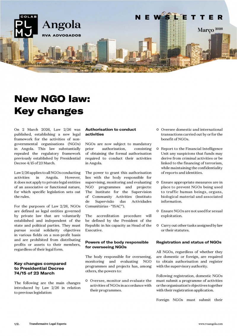 On 2 March 2026, Law 2/26 was published, establishing a new legal framework for the activities of non governmental organisations (NGOs) in Angola.